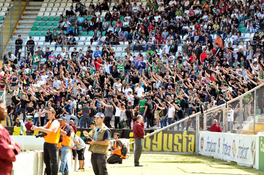La diferencia entre aficiones era más que evidente, sobre todo cuando el Hércules marcó el segundo gol. En ese momento aficionados del Elche abandonaban el campo, mientras que los herculanos empezaban a entonar "olés". Sabían que quedaba poco para el final y tenían que hacer que el equipo no se viniera abajo. Los jugadores desde el campo incitaban a los hinchas para que no dejasen de animar y la parroquia blanquiazul respondió de tal manera que la comunión entre afición y equipo funcionó y llegó el tercer gol.